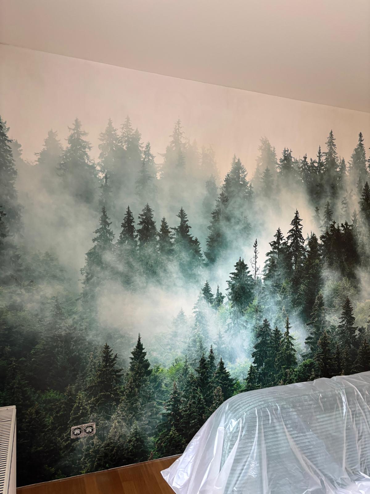 Das Ergebnis zeigt, wie aus einer schlichten Rohwand eine beeindruckende, moderne Akzentfläche entsteht. Die hochwertig angebrachte Fototapete mit Waldmotiv verleiht dem Raum Tiefe, Ruhe und eine natürliche Atmosphäre. Dank der exakten Untergrundvorbereitung liegt die Tapete faltenfrei, nahtlos und absolut sauber an – ein professioneller Abschluss, der den gesamten Raum aufwertet.