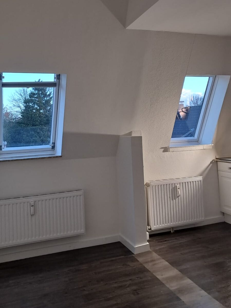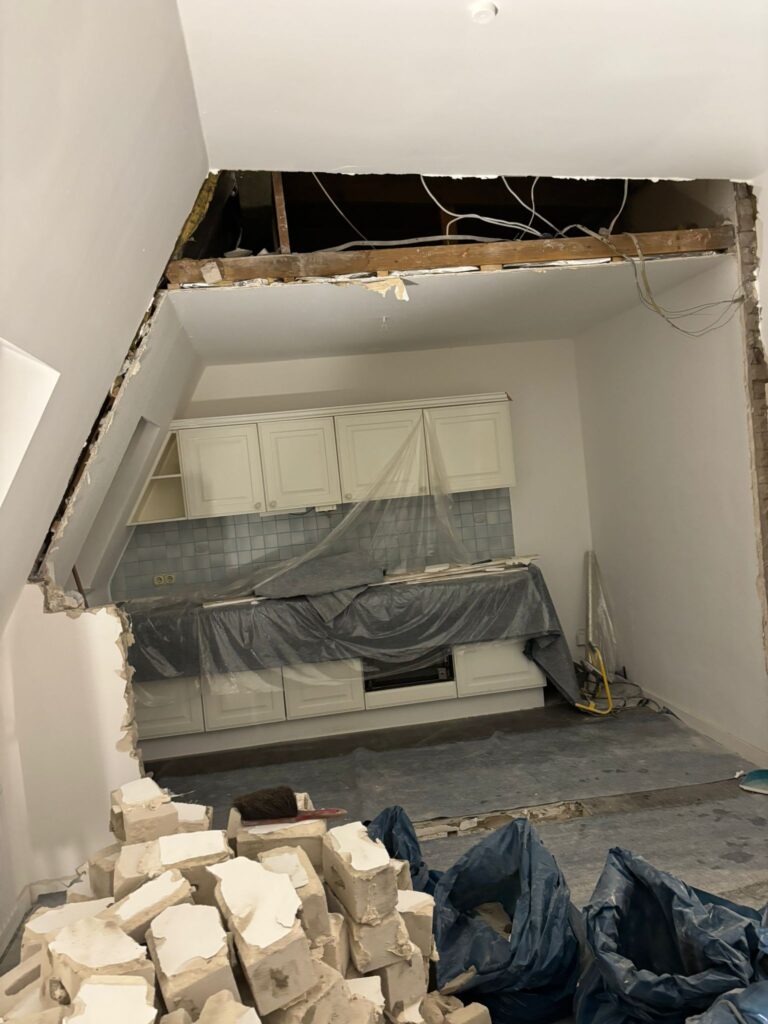 In dieser Wohnung in Hamburg befand sich ursprünglich eine Wand an einer unpraktischen Stelle. Sie schränkte den Raum stark ein, besonders im Bereich unter der Dachschräge. Die alte Wand unterbrach den natürlichen Lichteinfall und machte eine funktionale Nutzung des Raumes schwierig.