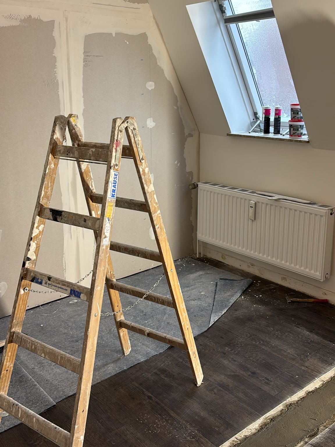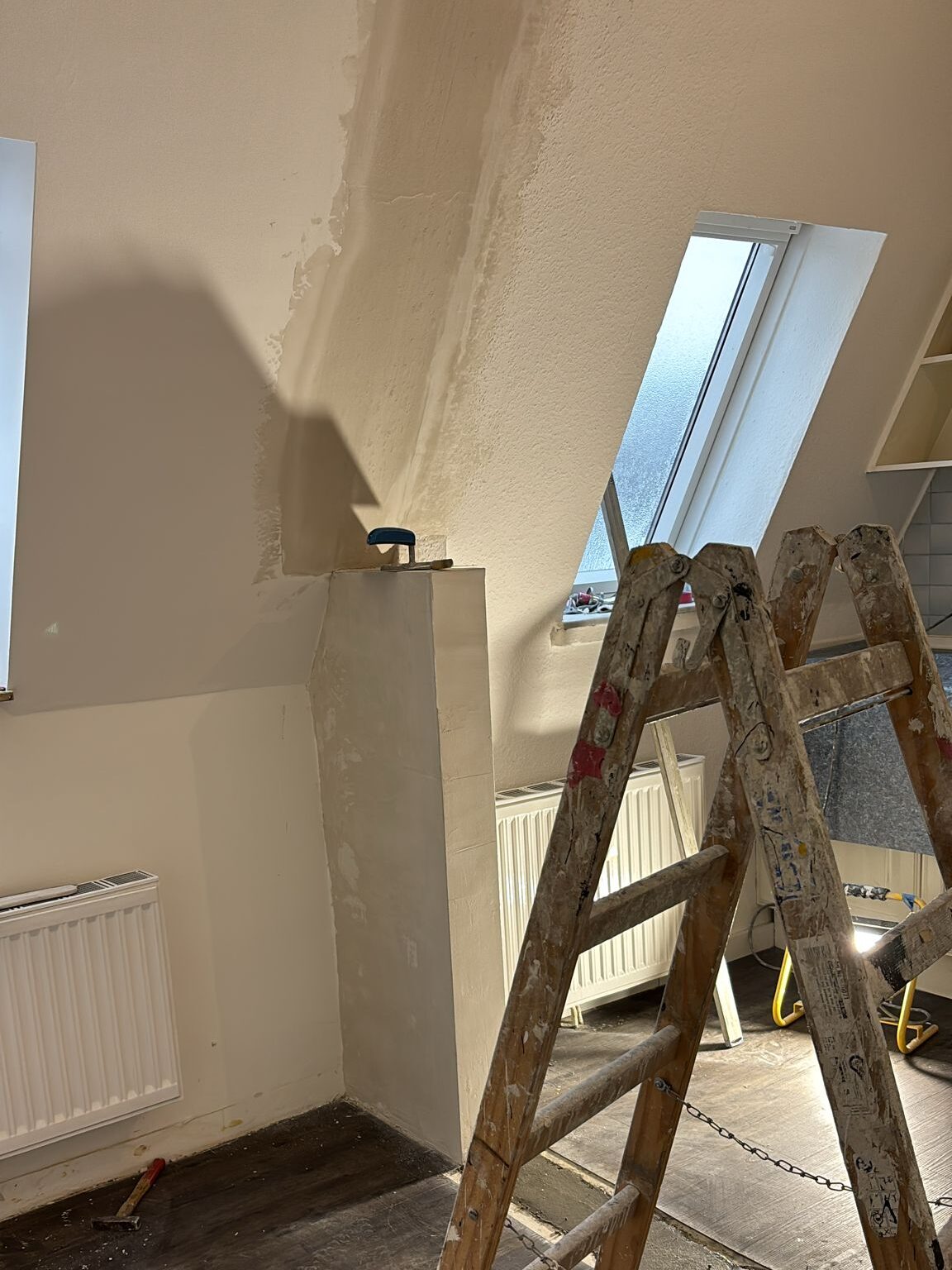 Die neue Wand passt sich optimal an Dachschräge, Fenster und Heizkörper an und sorgt für eine moderne, klare Raumaufteilung mit deutlich mehr Wohnkomfort.