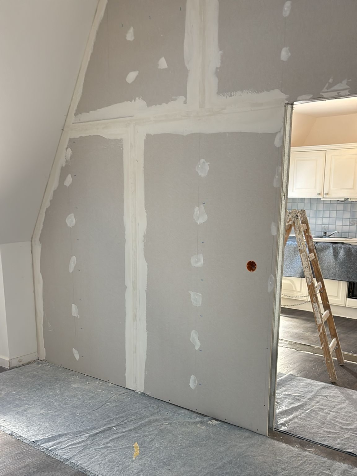 Nach Abschluss der Beplankung haben wir sämtliche Fugen verspachtelt, Kanten sauber ausgearbeitet und die gesamte Fläche für die finale Oberflächenbehandlung vorbereitet. Das Ergebnis ist eine neue, optisch vollständig integrierte Wand, die sich harmonisch in den Raum einfügt und eine klare, funktionale Raumtrennung ermöglicht – als wäre sie schon immer Teil der ursprünglichen Architektur gewesen.
