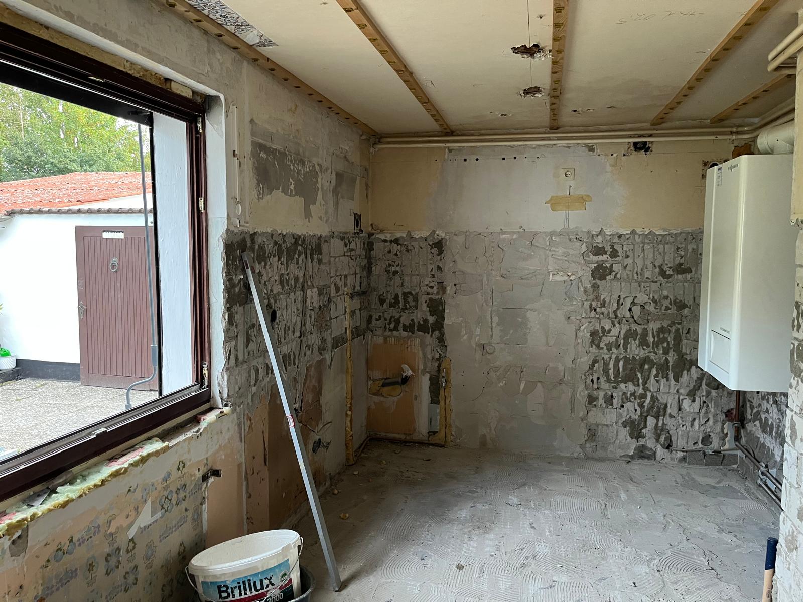Aus einem in die Jahre gekommenen Raum entstand durch unsere Renovierungsarbeiten ein moderner und einladender Wohnbereich. Zu Beginn befand sich der Raum in stark abgenutztem Zustand: alte Wandbeläge, sichtbare Leitungen und eine veraltete Struktur ließen ihn dunkel und ungemütlich wirken. Trotz dieses ersten Eindrucks war jedoch sofort klar – hier steckt enormes Potenzial. Mit einem klaren Konzept und viel handwerklichem Können machten wir uns daran, diesen Raum vollständig zu verwandeln.
