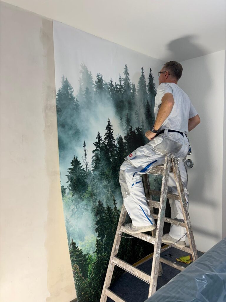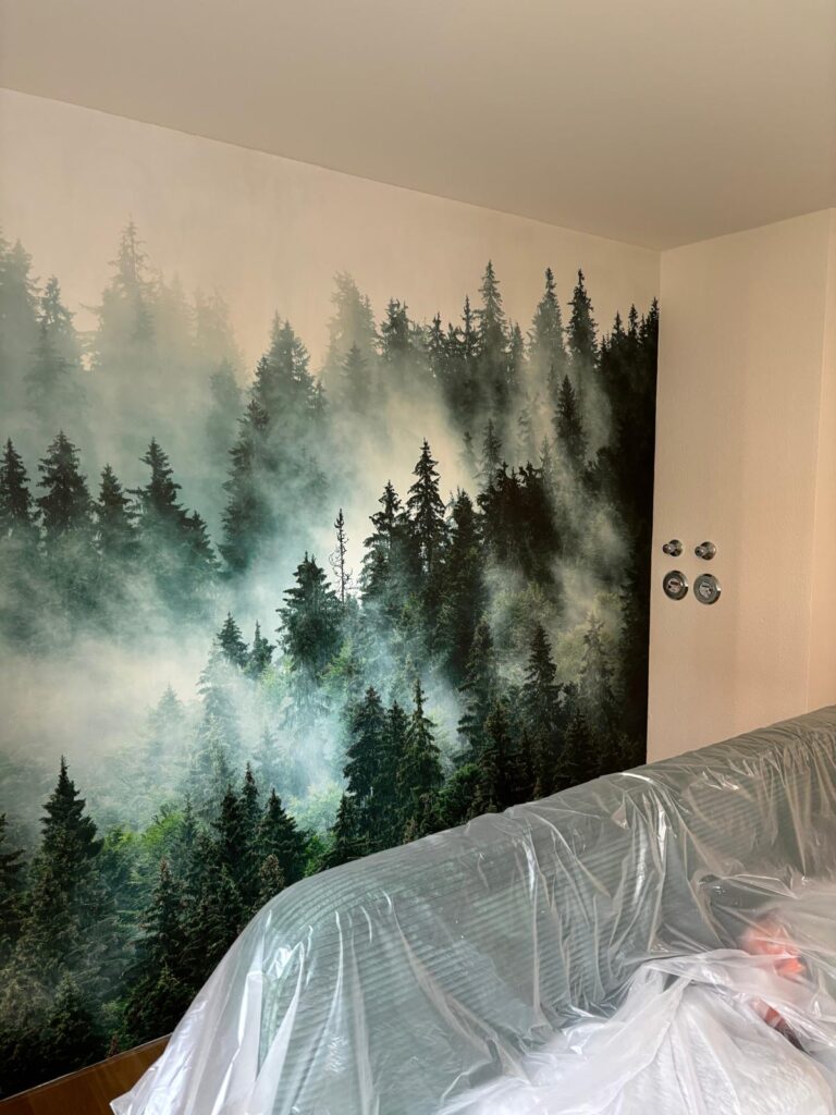 Das Ergebnis zeigt, wie aus einer schlichten Rohwand eine beeindruckende, moderne Akzentfläche entsteht. Die hochwertig angebrachte Fototapete mit Waldmotiv verleiht dem Raum Tiefe, Ruhe und eine natürliche Atmosphäre. Dank der exakten Untergrundvorbereitung liegt die Tapete faltenfrei, nahtlos und absolut sauber an – ein professioneller Abschluss, der den gesamten Raum aufwertet.