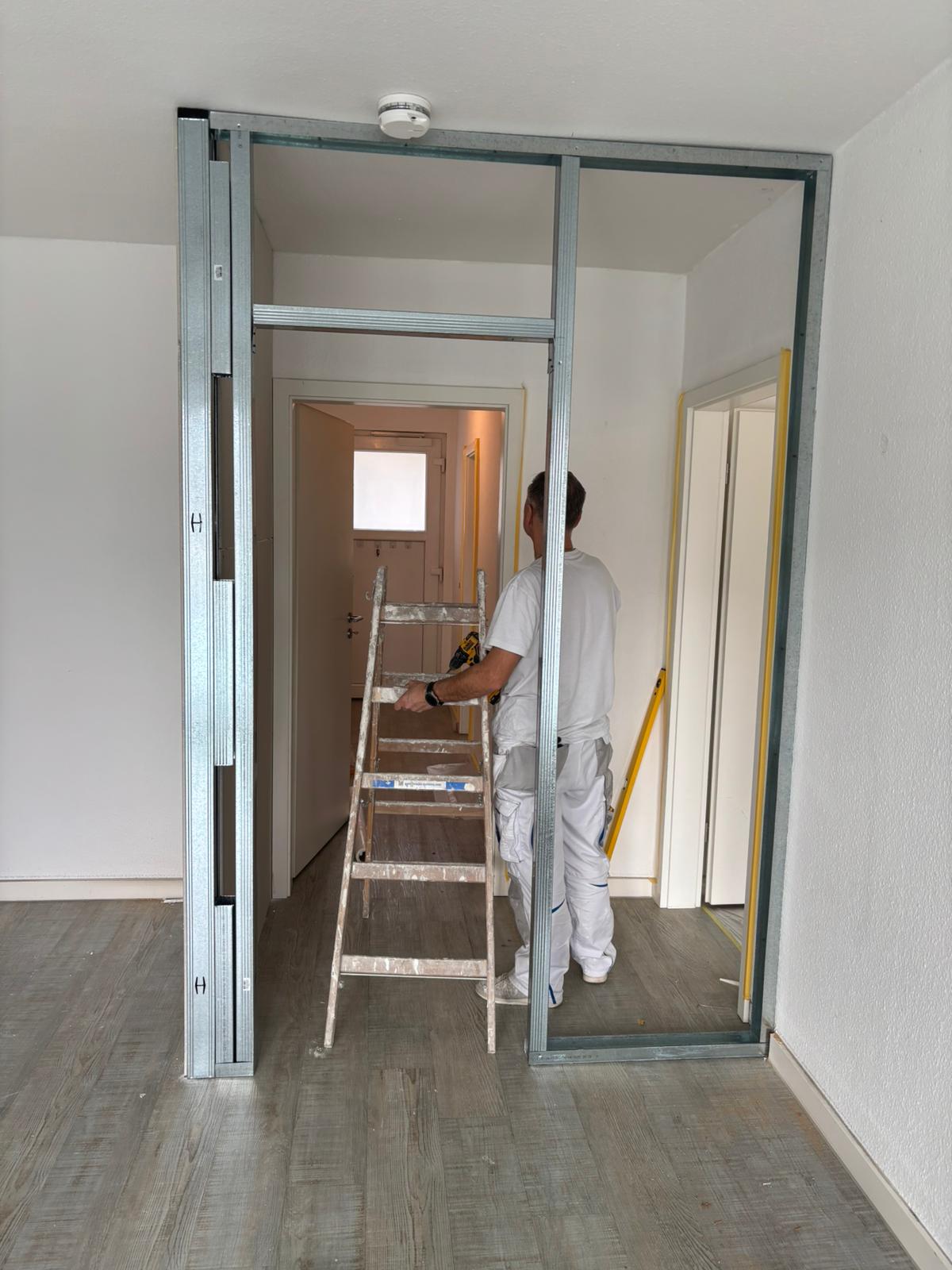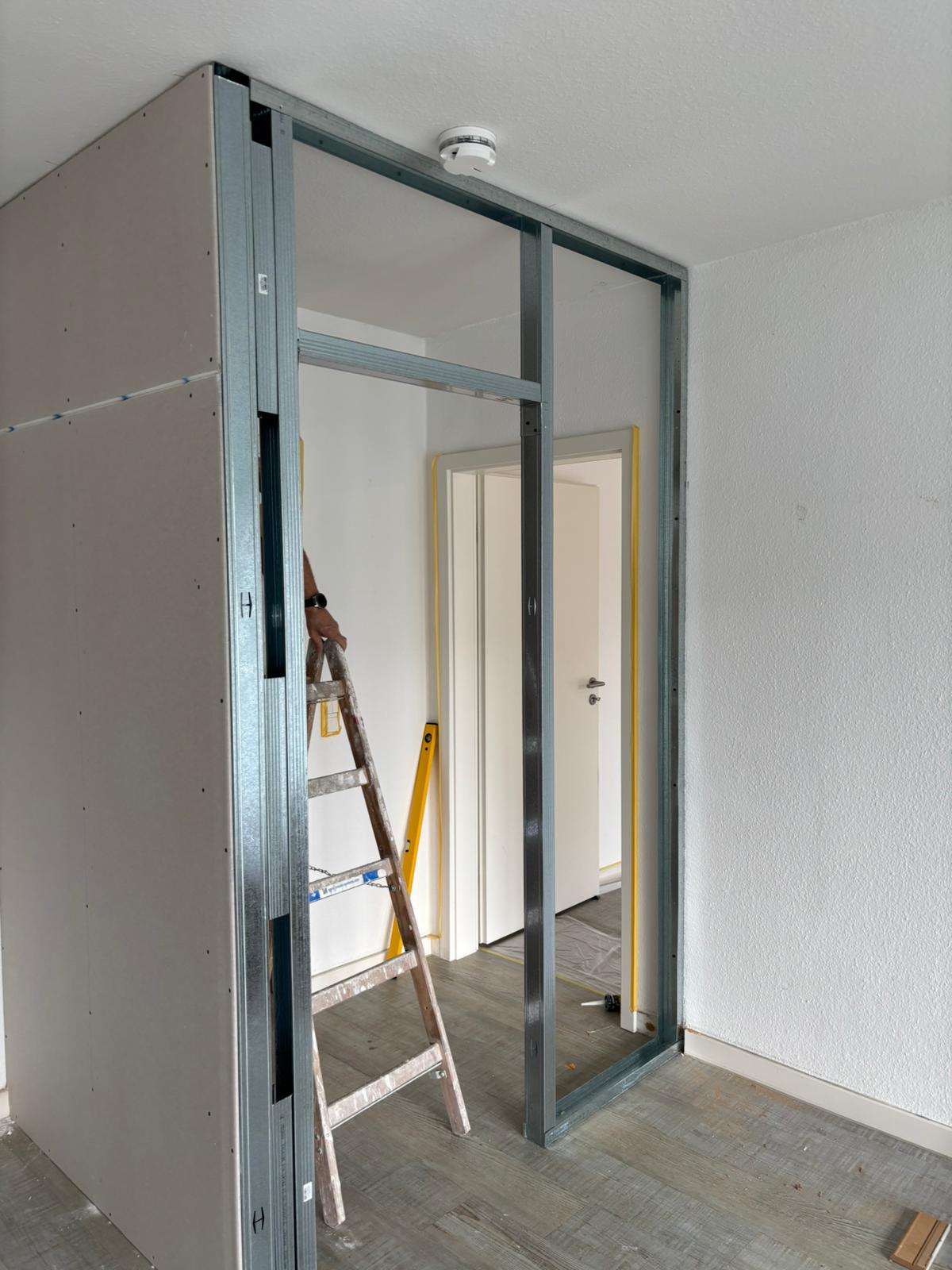 Im ersten Schritt installierten wir eine stabile Metallständer-Konstruktion, die als tragende Unterkonstruktion für die spätere Wand dient. Diese Profile wurden präzise ausgerichtet, sicher im Boden, an den Wänden und an der Decke verankert und inklusive Türöffnung vorbereitet. Anschließend erfolgte die fachgerechte Beplankung mit Gipskartonplatten. Alle Platten wurden passgenau zugeschnitten, montiert und sauber verschraubt.