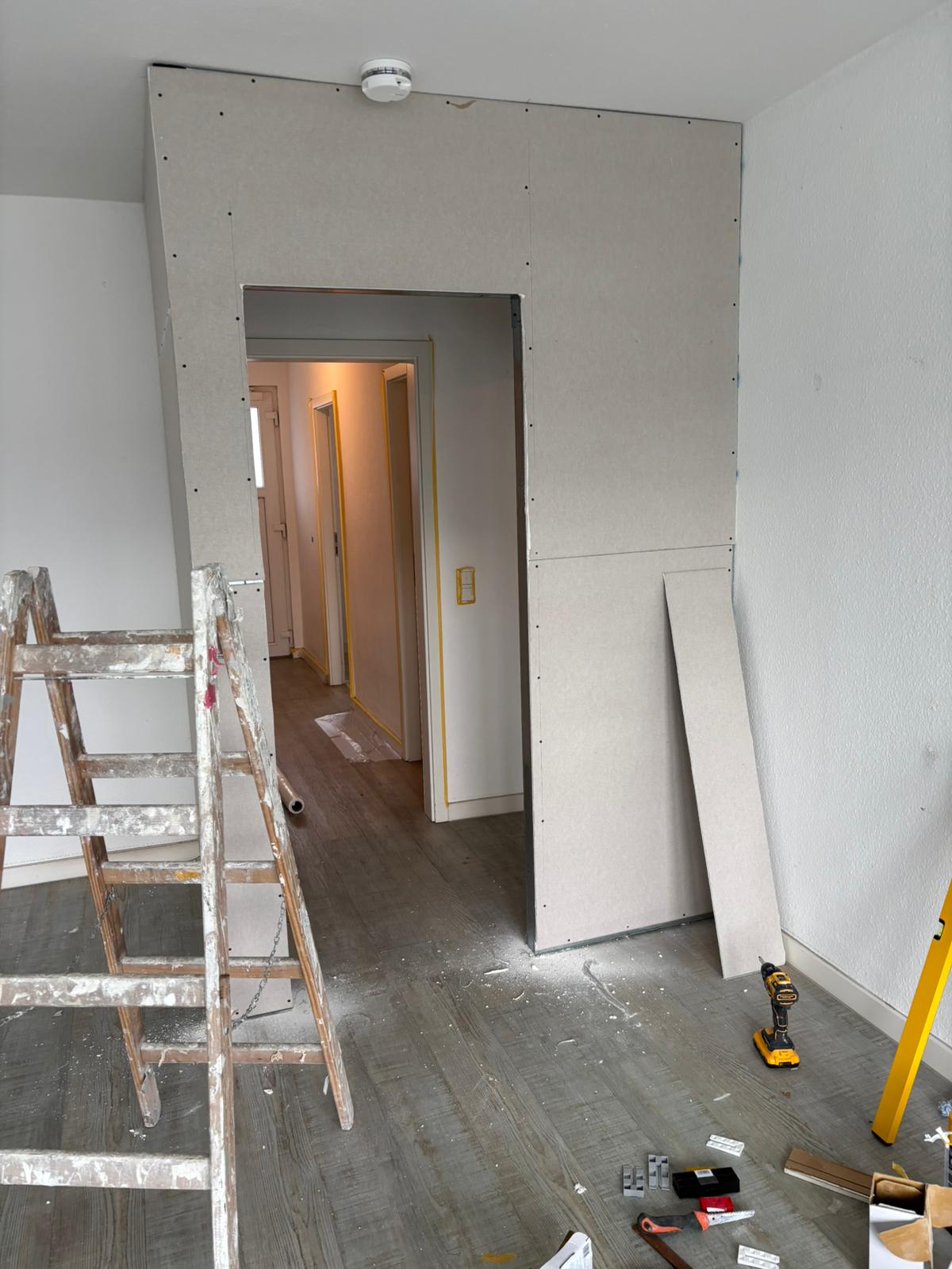 Nach Abschluss der Beplankung haben wir sämtliche Fugen verspachtelt, Kanten sauber ausgearbeitet und die gesamte Fläche für die finale Oberflächenbehandlung vorbereitet. Das Ergebnis ist eine neue, optisch vollständig integrierte Wand, die sich harmonisch in den Raum einfügt und eine klare, funktionale Raumtrennung ermöglicht – als wäre sie schon immer Teil der ursprünglichen Architektur gewesen.
